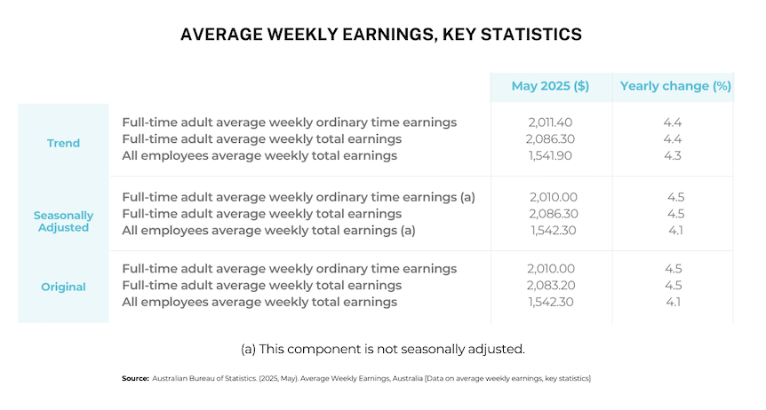 Wage growth has been another bright spot in Australia’s economic recovery. In May 2025, average weekly earnings for full-time adults climbed past the $2000 mark for the first time, reflecting a 4.5% annual increase.